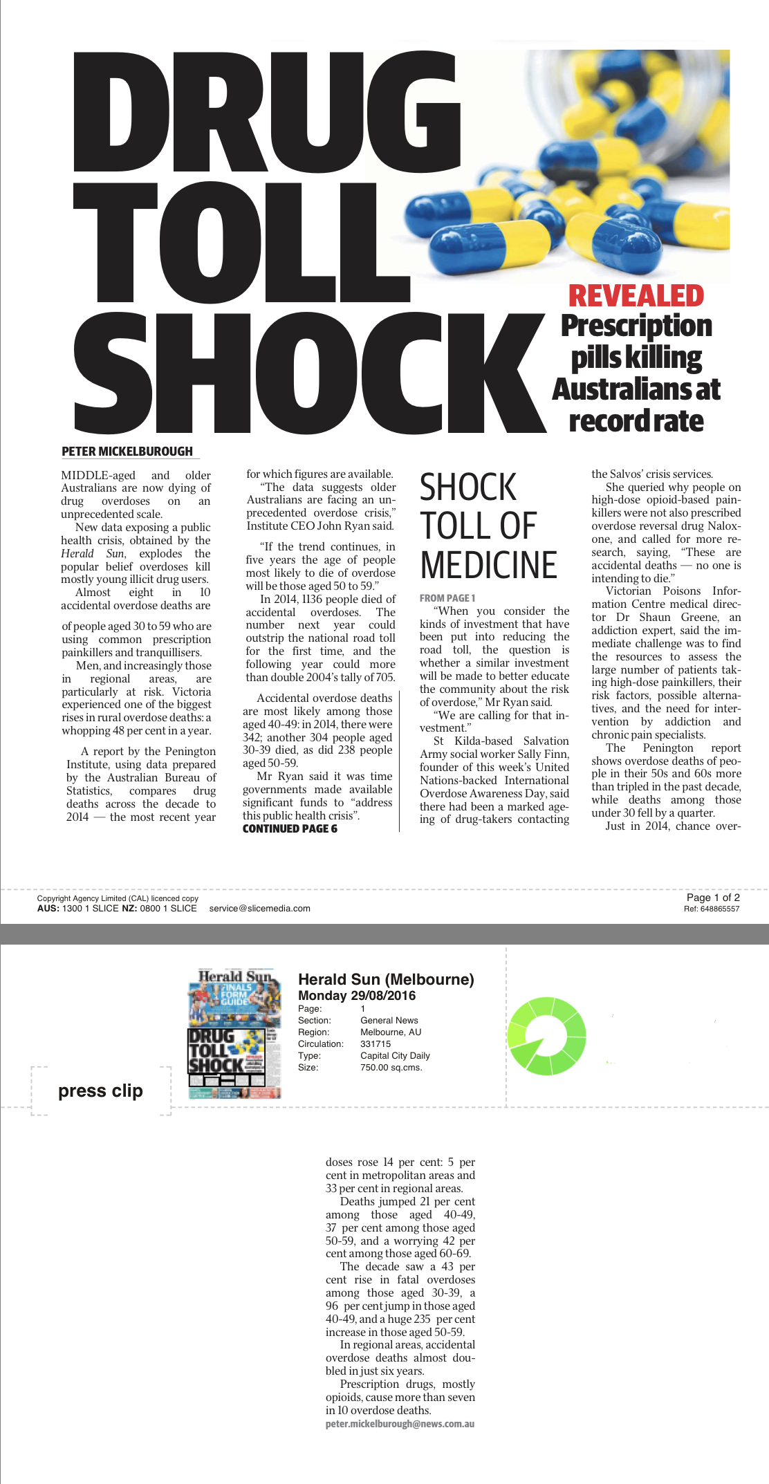 - Drug Toll Shock – Herald Sun, Page 1, Monday 29/08/2016
